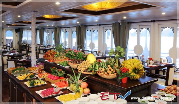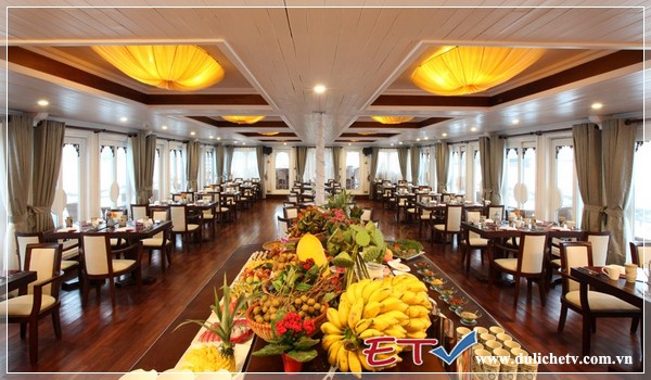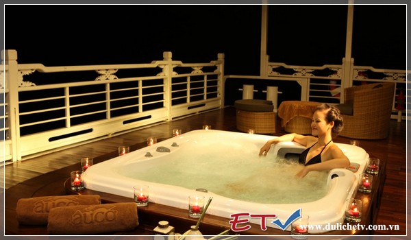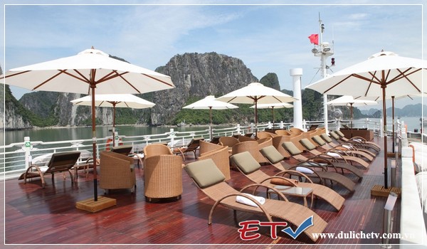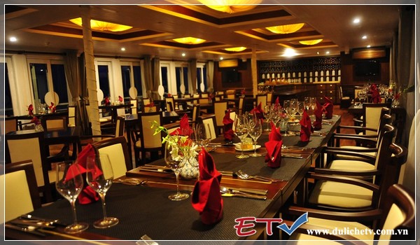 - Bar: Trên tầng thượng của tàu là khu quầy Bar với không gian mở, tuân theo quy tắc phong thủy: Nóng - Động - Năng, hòa hợp với 3 yếu tố khác là Lạnh - Trung - Thổ. Ngoài ra thưởng thức đồ uống trong không gian mở, với nội thất là đồ mây tre quả thực rất đặc biệt, sẽ là một ấn tượng khó quên cho mỗi du khách. Đây còn là nơi thư giãn và nghỉ ngơi sau một ngày dài tham gia các hoạt động giải trí trong chương trình, thưởng thức ly cocktail mát lành và chiêm ngưỡng cảnh hoàng hôn từ Vịnh.