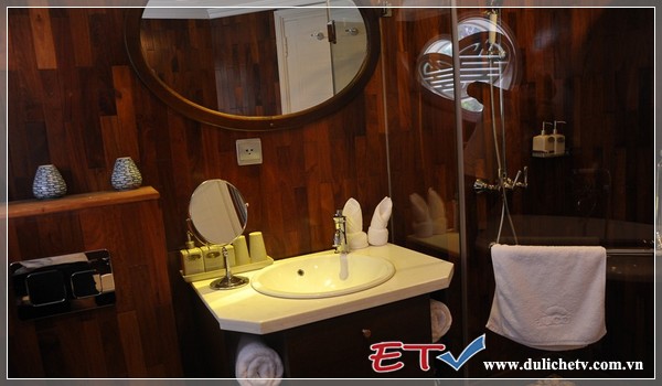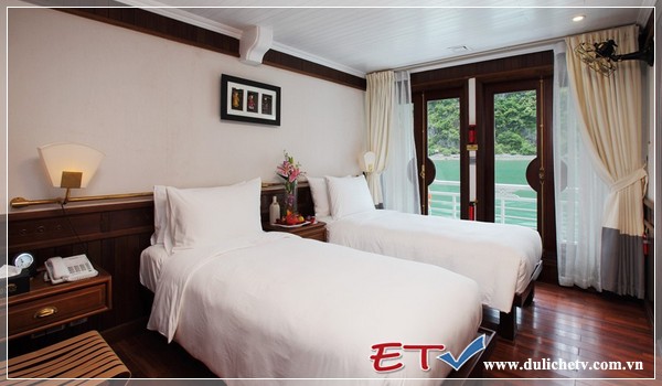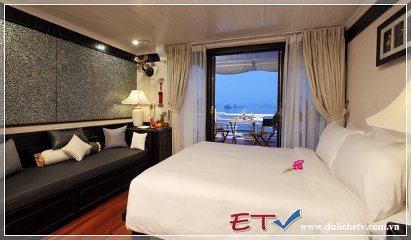 - Phòng Deluxe: Nằm trên boong chính, phòng tiêu chuẩn cao cấp, rộng 20 m2 với 2 giường đơn hoặc 1 giường đôi cùng với sofa uống trà. Mỗi phòng còn trang bị thiết bị nghe nhạc MP3 hiện đại, tiện lợi cho nhu cầu giải trí tại phòng. Phòng tắm, thiết kế đặc biệt với gỗ và khảm trai, với buồng tắm đứng có cửa sổ ảnh, giúp khách có thể vừa thư giãn vừa thưởng ngoạn được cảnh đẹp bên ngoài qua cửa sổ.