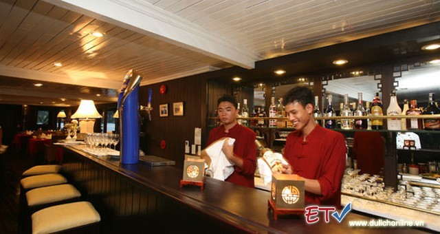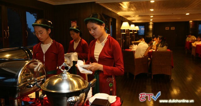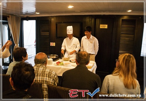 Các bữa ăn trên tàu gồm các món ăn Việt Nam, hải sản và các món quốc tế. Du khách có những yêu cầu đặc biệt về thực đơn, dị ứng thực phẩm hay chế độ ăn riêng xin vui lòng thông báo ít nhất 1 tuần trước chuyến đi.